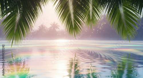 Tropical Oasis Reflection: Serene coastal scene, a shimmering sea beneath a lush canopy of tropical foliage, a tranquil moment where the vibrant colors blend, creating a picturesque paradise