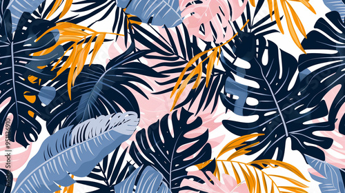 Tropical palm leaf pattern with navy, pink, and mustard colors on white background