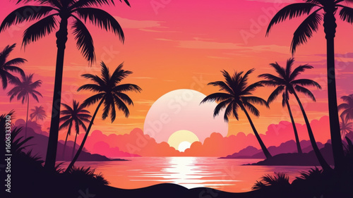 Tropical palm tree leaves silhouetted against a vivid orange and pink sunset sky.