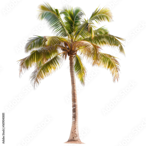Tropical palm tree, vibrant green and light beige trunk, full, lush fronds