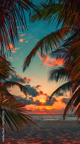 Tropical palms framing a vibrant sunset on a beach, with the sky lit up in brilliant shades of orange and pink