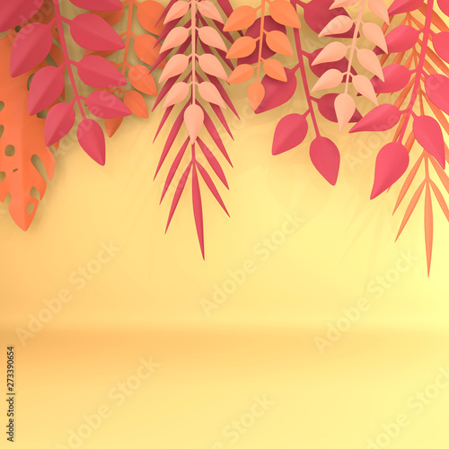 Tropical paper palm, monstera leaves frame. Summer tropical leaf. Origami exotic hawaiian jungle, summertime background. Paper cut style. 3d render