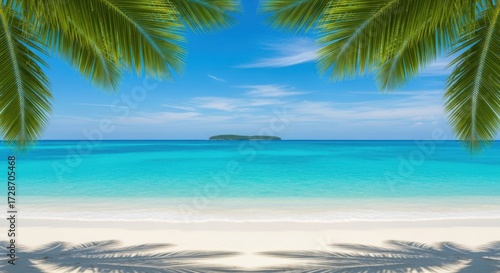 Tropical paradise beach scene with palm trees and turquoise ocean under a bright blue sky
