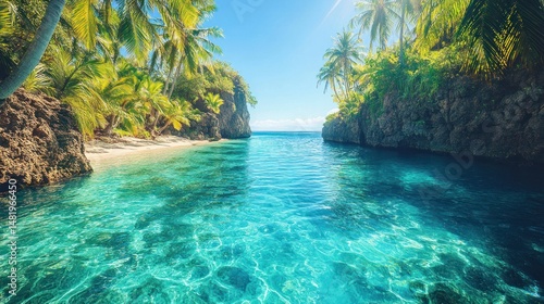 Tropical paradise cove with turquoise water, palm trees, and secluded beach