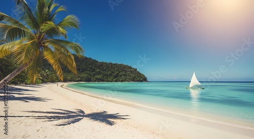 Tropical Paradise Escape: Serene Beach with Sailboat and Palm Tree