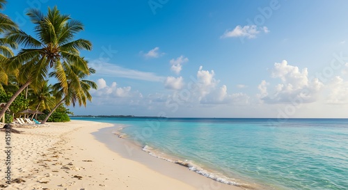 Tropical paradise: sun-drenched beach with swaying palm trees, crystal-clear ocean, and golden sand