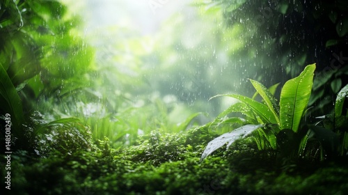 Tropical rainforest sunlight piercing through jungle canopy in green lush nature composition background