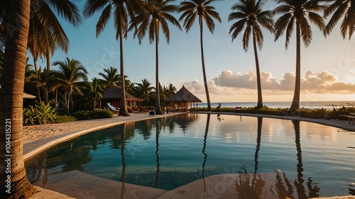 Tropical Resort Poolside Retreat at Sunset with Palm Trees