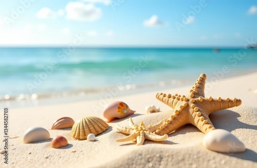 Tropical sandy beach background with seashells and empty space for text. Perfect for advertising, travel promotions, vacation themes, product displays, and marketing materials.