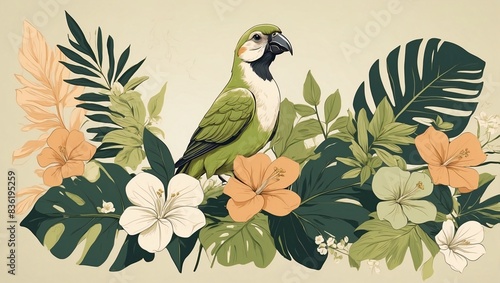 Tropical Serenity: Parrot Amidst Hibiscus Blooms