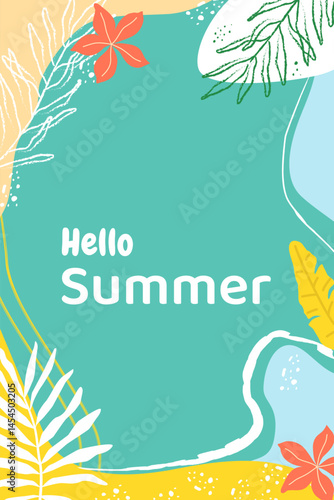 Tropical summer greeting card with abstract waves and floral elements. Features text Hello Summer. Great for promotions, banners, or digital content.