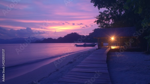 Tropical sunset boardwalk at island beach hut