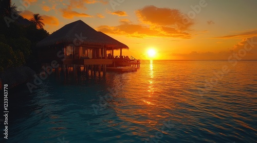 Tropical Sunset over the Water with a Overwater Bungalow at Dusk, Perfect Vacation