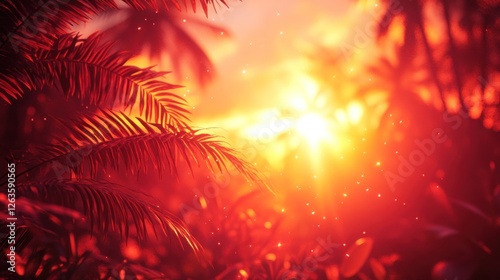 Tropical sunset through palm leaves; fiery glow; bokeh effect; background