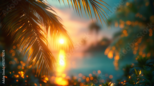 Tropical Sunset Through Palm Leaves with Soft Ocean Reflections