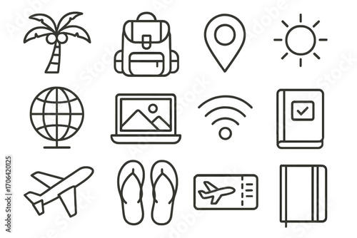 Tropical Travel Icons. Line style icons of tropical travel gear: palm tree, backpack, location, sun icon; globe, laptop, WiFi,