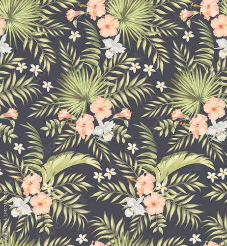 Tropical vector seamless background. Jungle pattern with exitic flowers, and palm leaves. Stock vector. Jungle vector vintage wallpaper