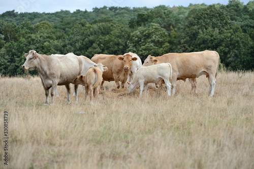 troupeau de vaches blonde d'Aquitaine au pré pendant une période de sécheresse, herbe jaunie