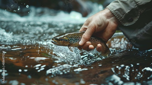 trout with background rushing brook, hand of fisherman.