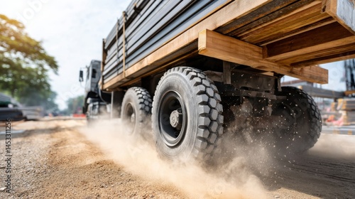Truck carrying metal beams kicks up dust on dirt road, heavy truck on a dusty construction site.