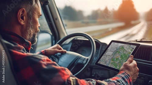 Truck Driver Checking GPS Map on Tablet for Route Tracking and Planning