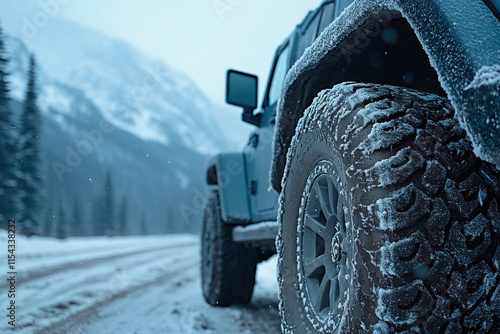 Truck driving down snowy road, surrounded by white winter landscape, with trees on each side and snow-covered mountains in the distance.