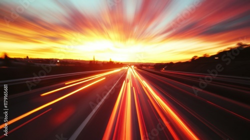 truck driving on an empty highway, sunset sky, focus on vehicle, motion blur, logistics on the go, bright colors, efficient and fast-paced, transportation service