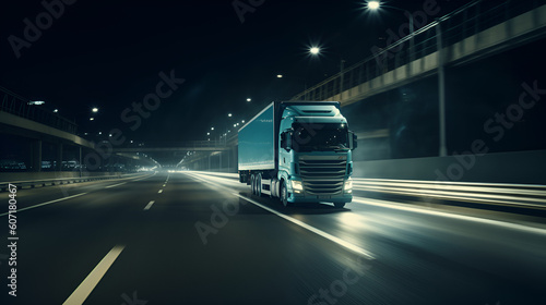 Truck driving on highway at night, car headlight light trail speed motion blur,futuristic logistic transportation background