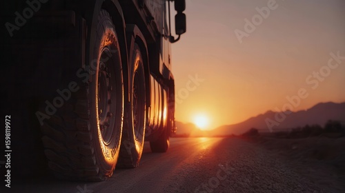Truck driving on road at sunset with scenic mountain view