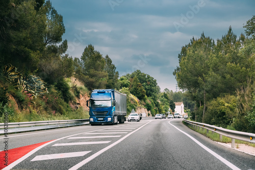 Truck Or Traction Unit In Motion On Road, Freeway. Asphalt Motorway Highway Against Background Of Forest Landscape. Business Transportation And Trucking Industry