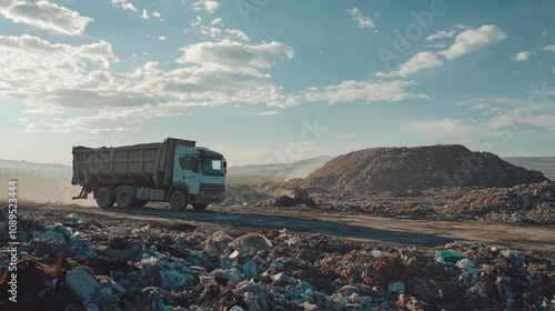 Truck Transporting Waste Through a Littered Landfill Under a Bright Sky with Clouds and Sunshine