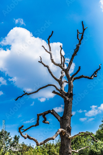 Trunk and twisted branches of a dead and dry tree with a deep blue sky and white clouds in the background, magical sunny summer day in the Netherlands