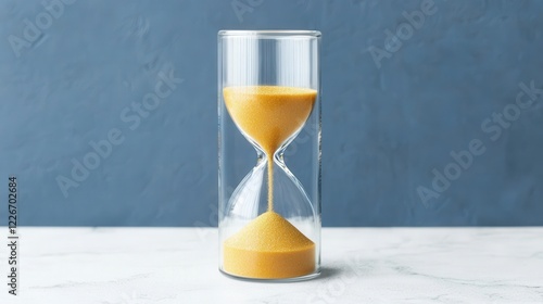 Trust confidence and transparency, A clear glass hourglass filled with golden sand sits on a marble surface against a blue backdrop, symbolizing the passage of time.