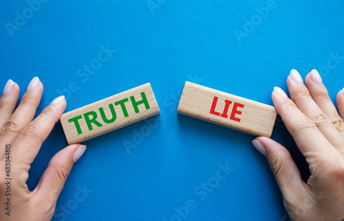 Truth or Lie symbol. Concept word Truth or Lie on wooden blocks. Businessman hand. Beautiful blue background. Business and Truth or Lie concept. Copy space