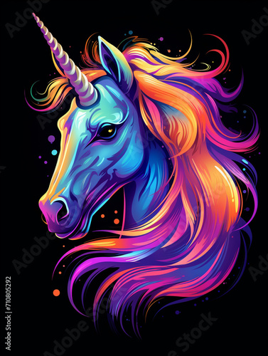 t-shirt design, a colorful unicorn head with rainbow mane created with Generative Ai