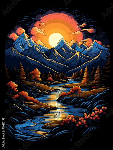 t-shirt design, the beautiful mountains near a river in flat style illustration, in the style of multidimensional shading created with Generative Ai