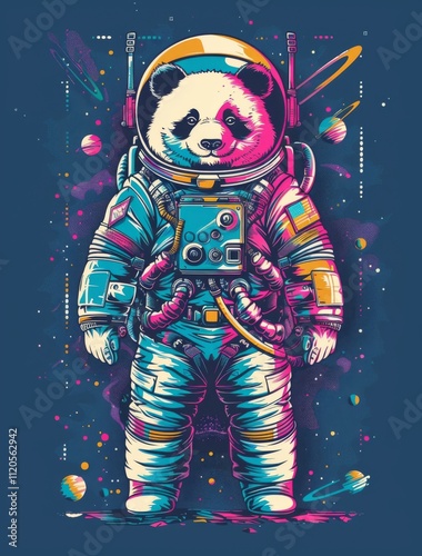 T-shirt design with panda bear astronaut in an astronaut costume. Colorful print design of bear astronaut in cartoon style on dark background. AI generated illustration