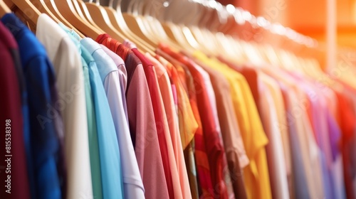 T-shirts of different colors hanging on a hanger in a store close-up
