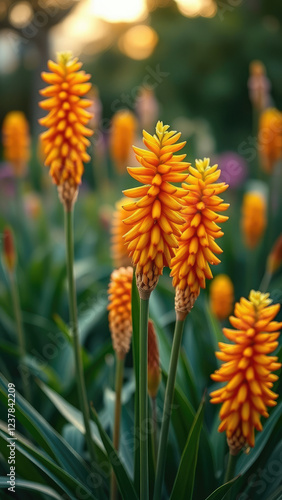 Tubular kniphofia flowers in garden with vibrant colors and unique shapes, kniphofia tubuliflora, colorful blooms, flowering plants, bright flowers