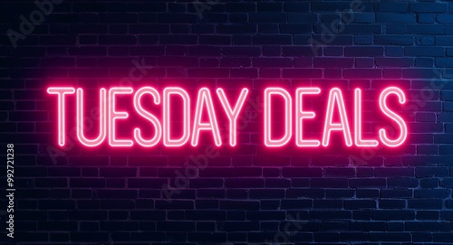 Tuesday deals word lettering glowing with neon light on dark brick wall background