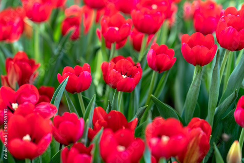 Tulips bloom in spring sunshine with brilliant colors rising up full of vitality in garden