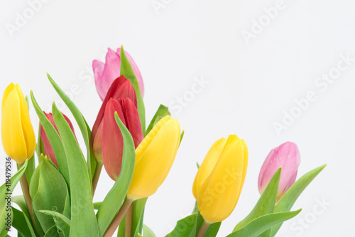 Tulips close-up on a white background. Different colors. Postcard, there is space for text. Background, texture. Spring and beauty
