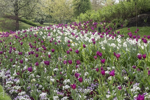 Tulips (Tulipa) and horned violets (Viola cornuta) in a flower bed, Lower Saxony, Germany