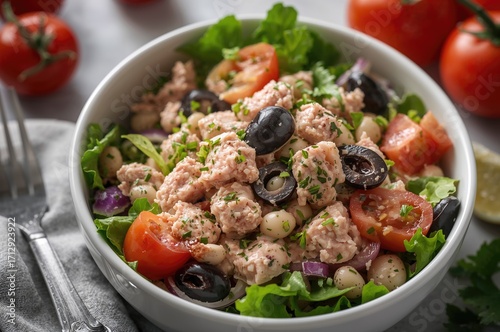Tuna and white bean salad with olives, red onions, and tomatoes. Nutritious meal