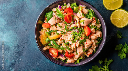 Tuna crowns fresh salad bowl, top view reveals delicious tomatoes, cuisine combines vegetables, healthy appetizer mingles lettuce with seafood