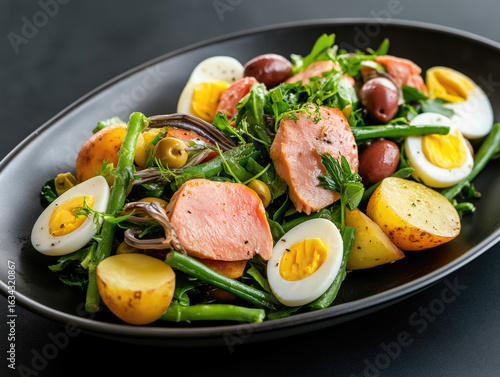 Tuna nicoise salad with green beans, potatoes, olives, hard-boiled eggs, and anchovies