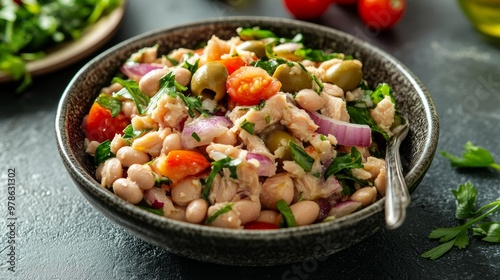 Tuna salad with white beans, tomatoes, and red onions. wholesome cuisine