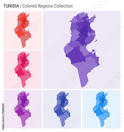 Tunisia map collection. Country shape with colored regions. Deep Purple, Red, Pink, Purple, Indigo, Blue color palettes. Border of Tunisia with provinces for your infographic. Vector illustration.