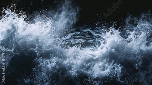 Turbulent white water splashing against dark background, creating a powerful sonic wave effect with dynamic liquid formations, representing sound vibration. Amazing view with flowing liquid particles