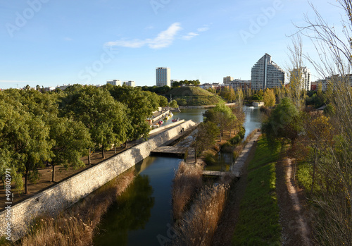 Turia river bed and gardens in the city park of the city of Valencia in Spain. View of the river from the bridge near the biopark.